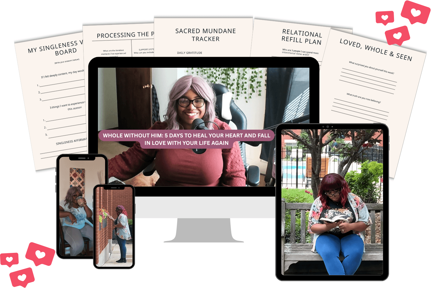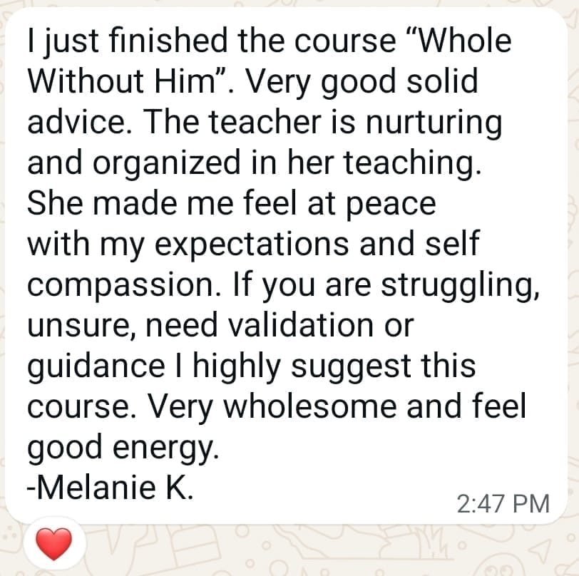 Most content for single women focuses on waiting for “the one.” Whole Without Him focuses on helping you enjoy your life right now — learning emotional wholeness, presence with God, and joy that doesn’t depend on your relationship status.